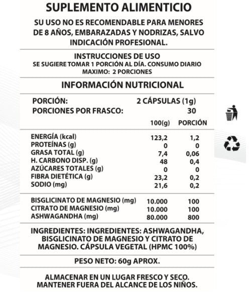Porción 2 cápsulas.Cada cápsula:400mg ashwagandha 50mg bisglicinato de magnesio50mg Citrato de magnesio